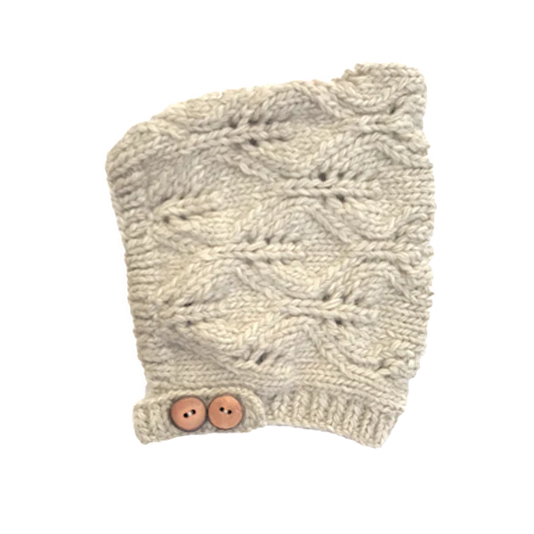 This hand-knit bonnet is made from 100% pure New Zealand Merino wool with a beautiful cable texture that provides stretch for a great fit on your little one's head.