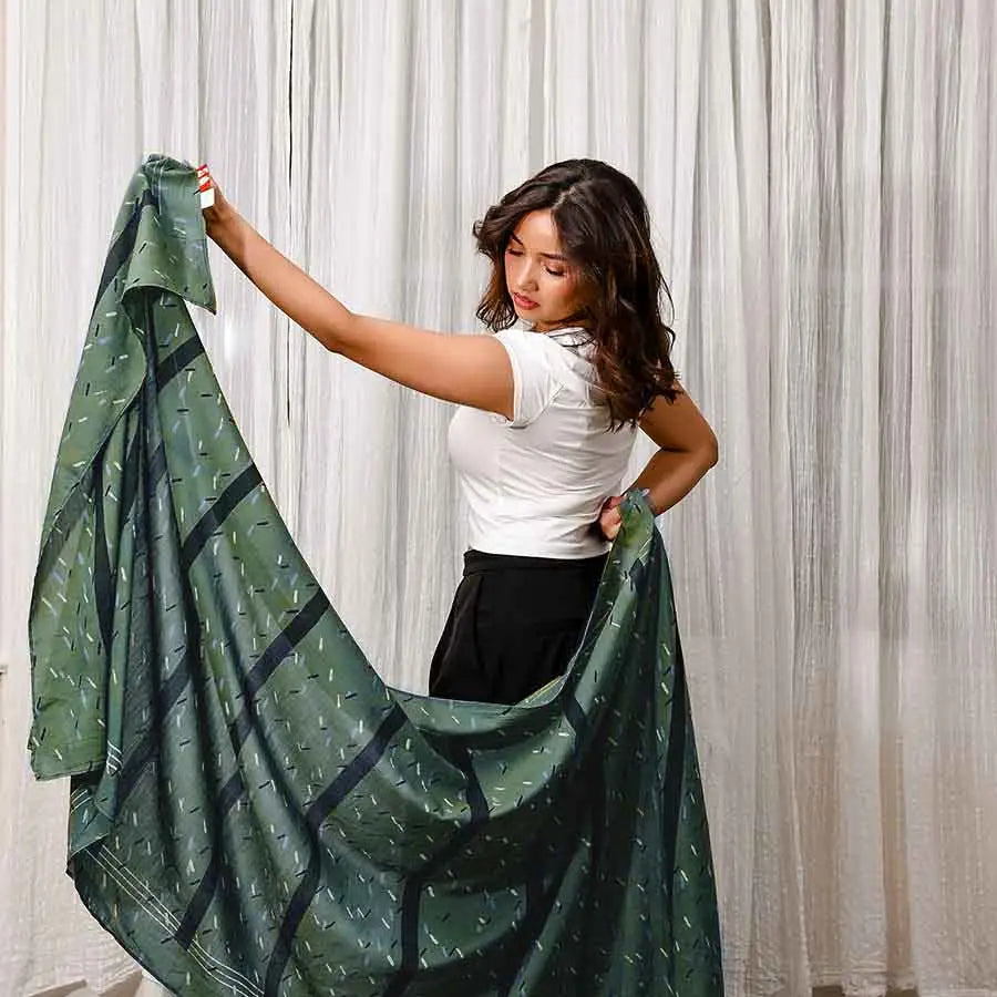 Hand block printed by talented artisans, it features a rich deep teal base with black and white accents. Dyed naturally using plant-based colors, this cotton-silk scarf feels soft, airy, and comfortable against the skin.