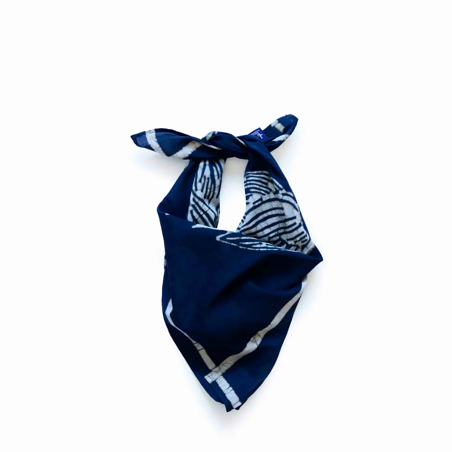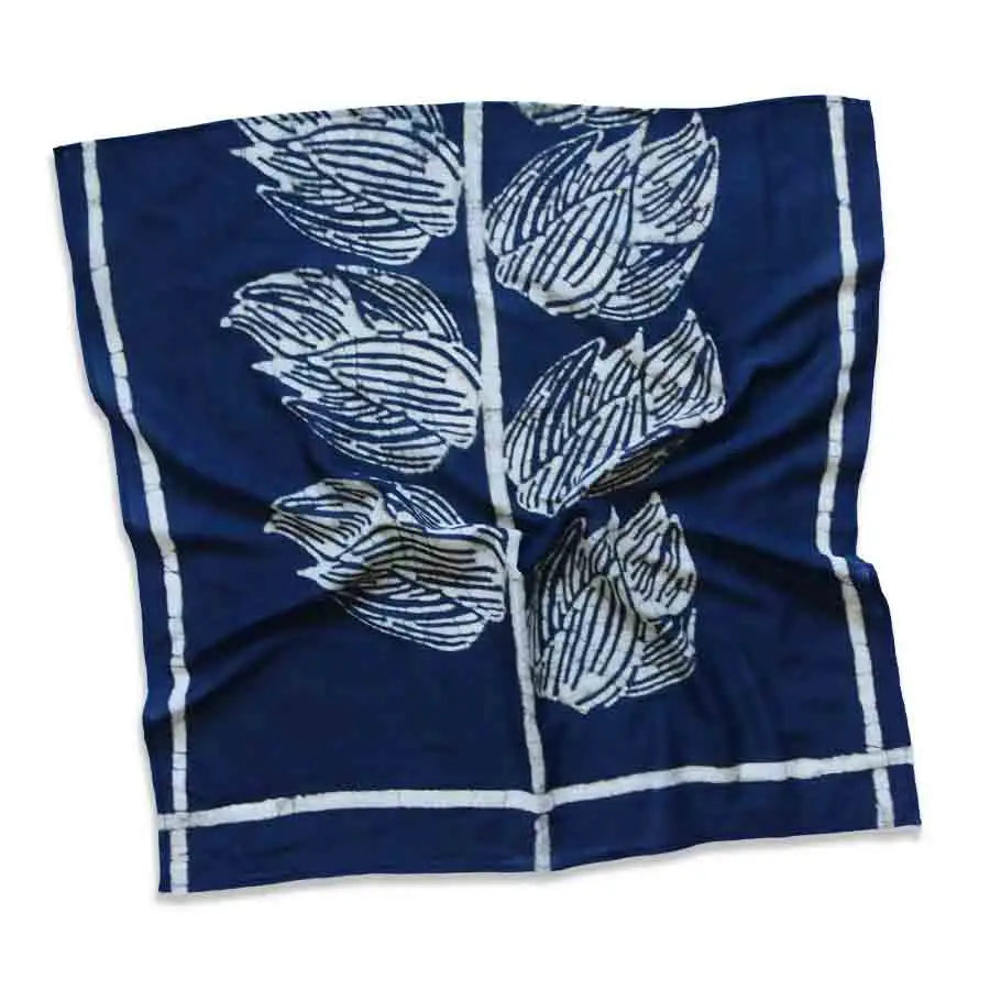 Each piece is uniquely hand-cut, making every bandana truly one of a kind. Hand-block printed with carved wooden blocks and naturally dyed, it features striking white leaf motifs resting on a dark indigo or black base.