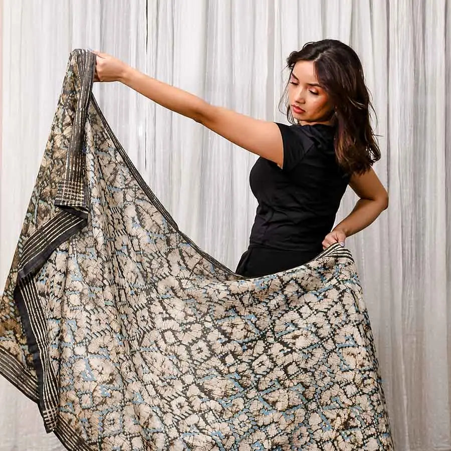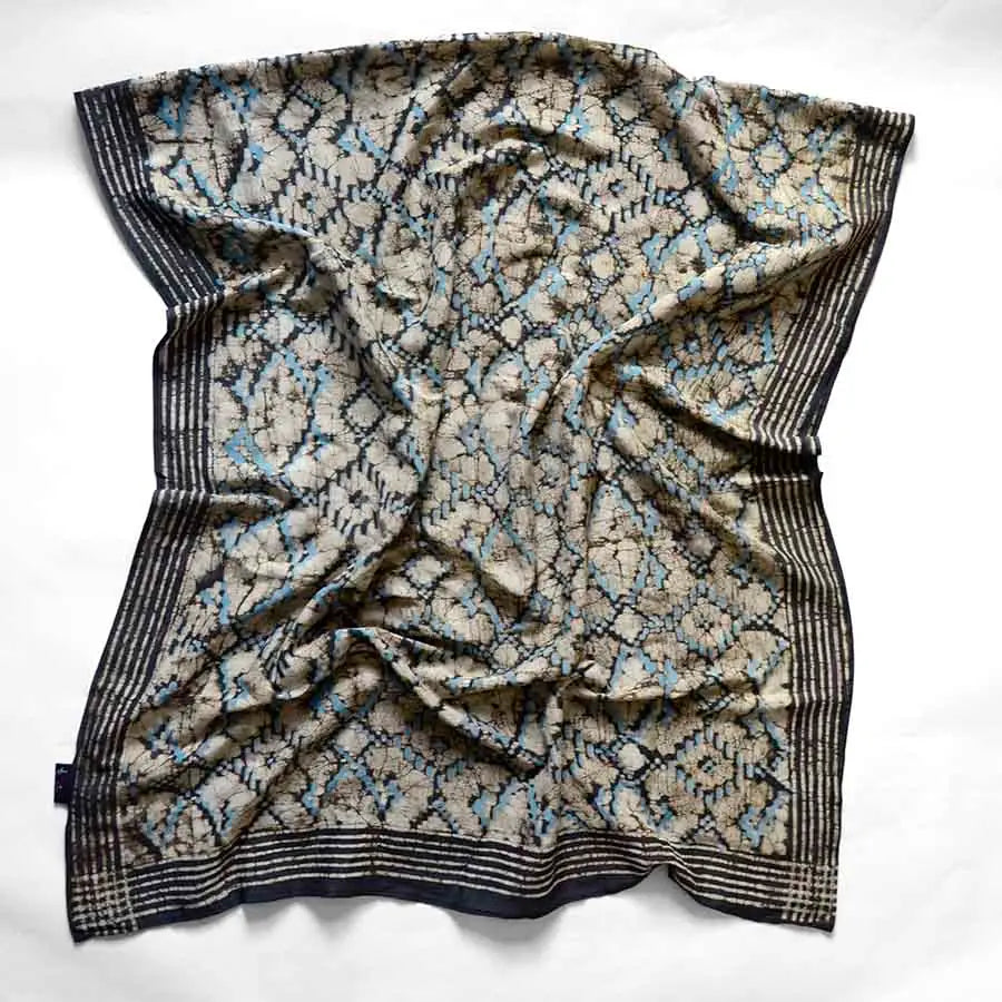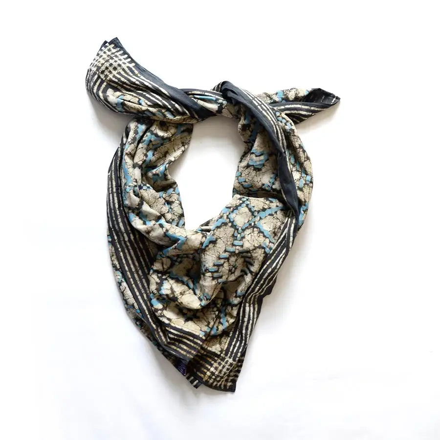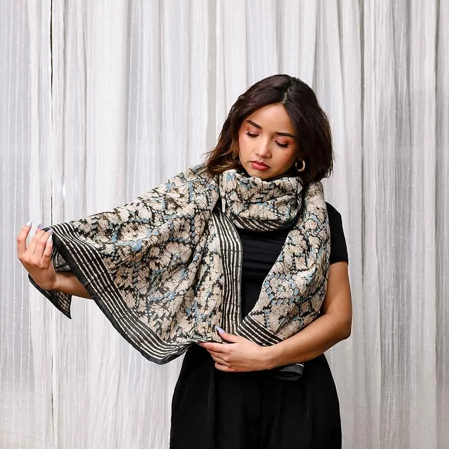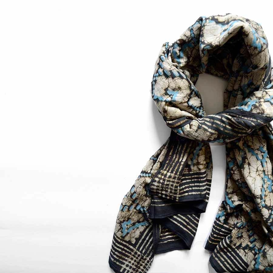The design is printed entirely by hand using carved wooden blocks, giving each impression its own subtle variation. Hand block printed and hand-dyed using natural colors, the scarf carries a mix of earthy neutrals and soft blues that make it easy to style through the seasons.