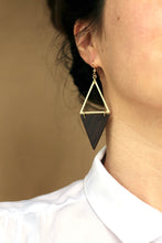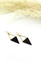 These geometric statement earrings are lovingly handmade with brass, reclaimed wenge wood and hung on 14K gold fill hooks.