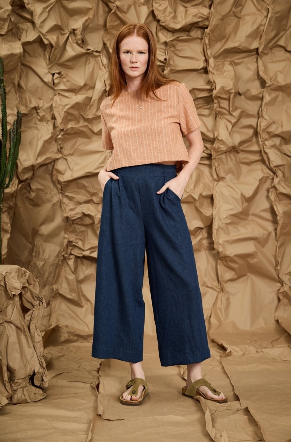 They feature a high waist with a stretchy waist band, a classic straight leg, and practical side pockets.