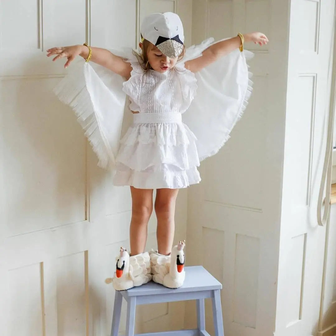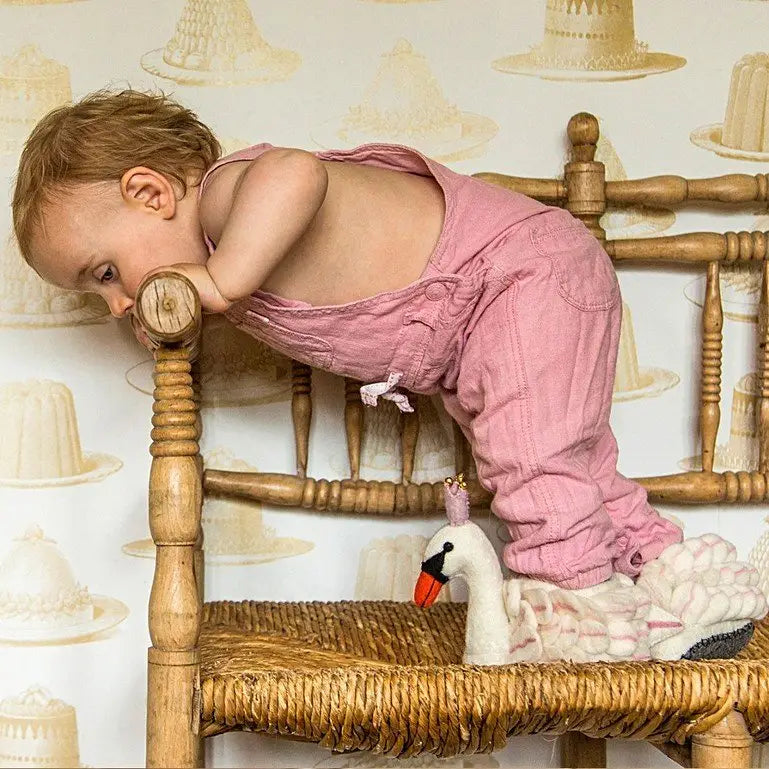 Made with organic, kind-to-skin felt and finished with hand-stitched anti-slip soles. These regal swan slippers are adorned with a tall crown and lots of felted feathers. They are perfect for imaginative play or adventuring around the house.