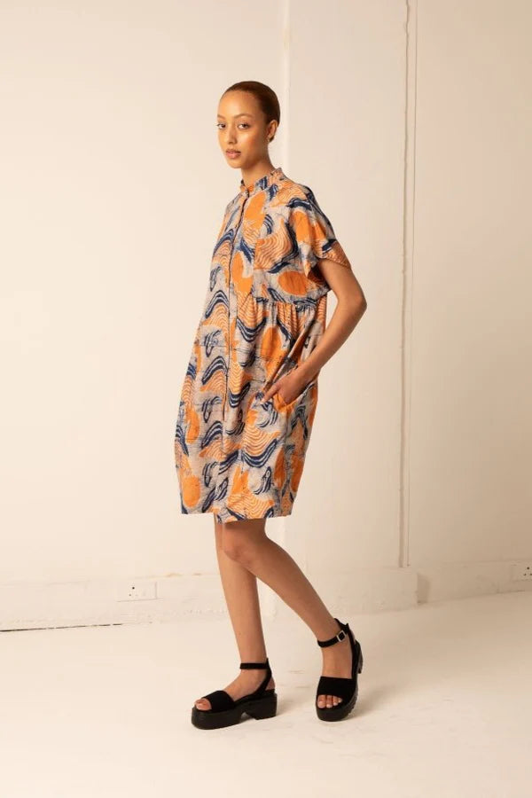 This beloved Bata dress with a relaxed, oversized fit features a mandarin collar and a button-down front closure. Its sculptural shape is enhanced by a back cinch tie and side gathers. It also has roomy inseam pockets so that you can carry your light essentials with you.