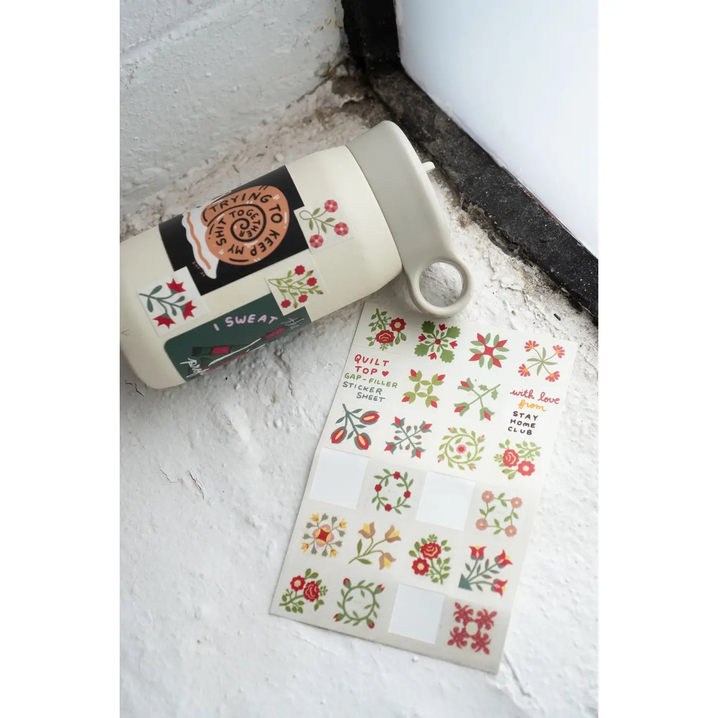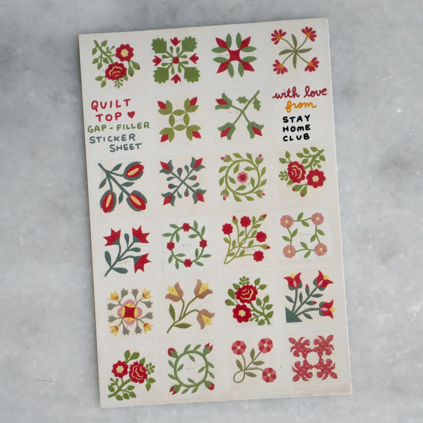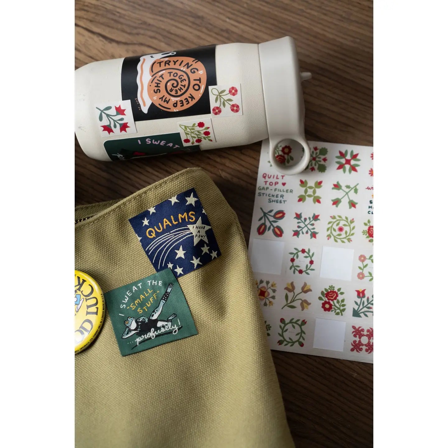 This is a 4" x 6" sheet of 22 teeny kiss-cut stickers using a public domain high resolution photo of an antique patchwork quilt made in the mid 1800s.