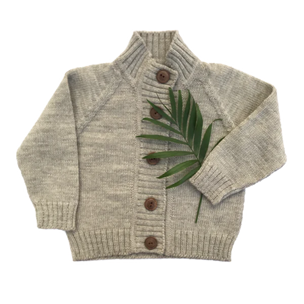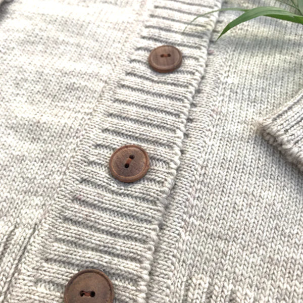 This is a hand-knit cardigan is made from 100% pure New Zealand Merino wool and finished with hand-made wood buttons.