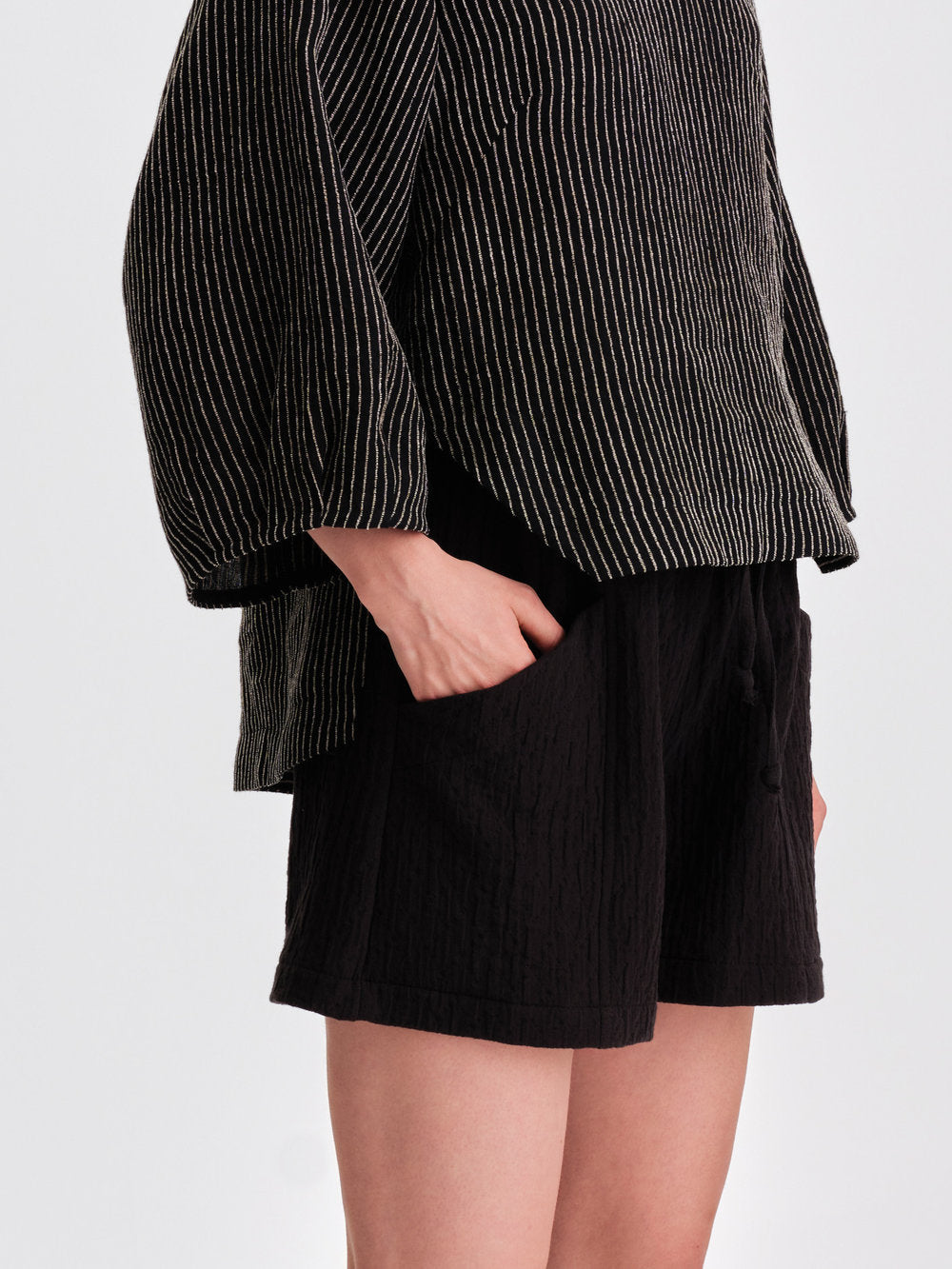 They feature an elasticized waistband with a drawstring for an adjustable fit. The bottom hem lands about mid thigh. Enjoy the practical front and back pockets where you can store your essentials, or treasures found along your journey.