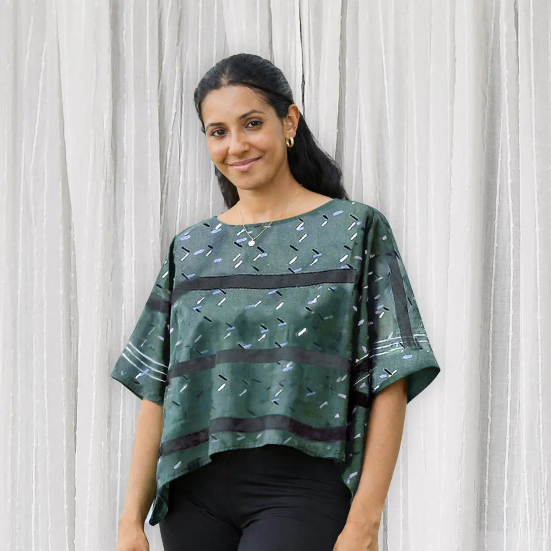 Hand block printed by skilled artisans, this crop top features a rich deep teal base scattered with subtle black and white accents—bringing depth, rhythm, and quiet joy to the pattern.